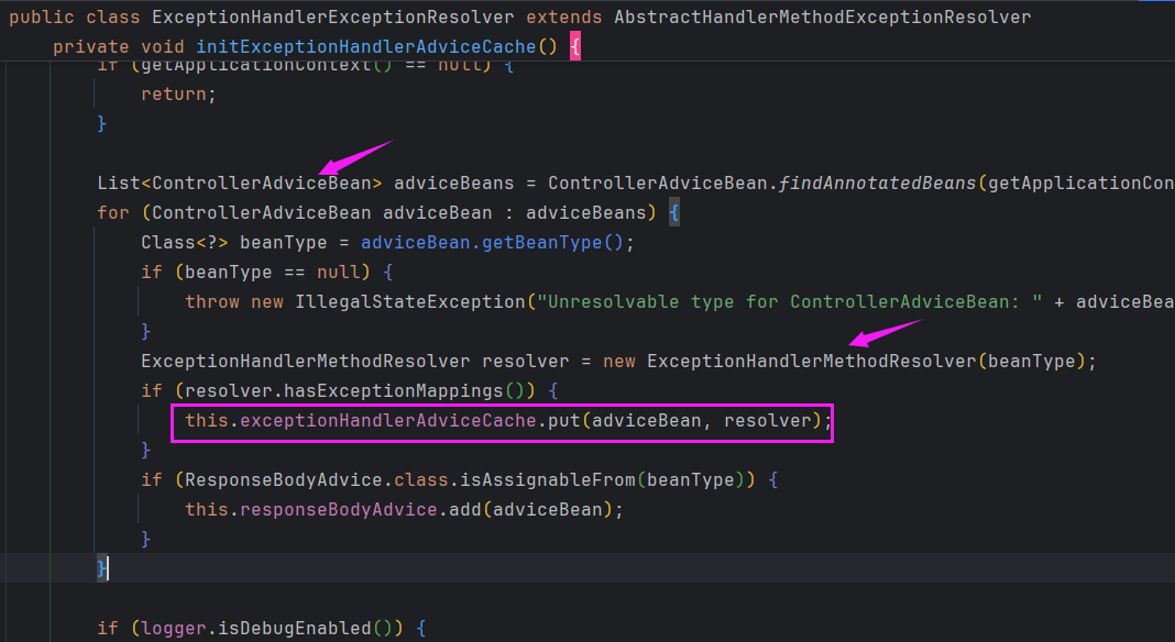 而ExceptionHandlerExceptionResolver的加载在初始化的时候,通过加@ControllerAdvice的Bean和加@ExceptionHandler的方法映射在一起。