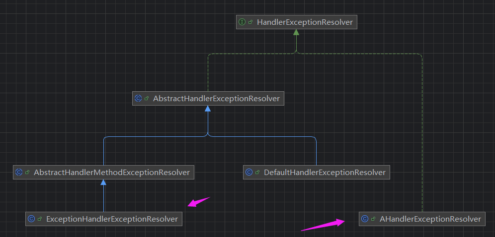从继承关系来看,ExceptionHandlerExceptionResolver和自定义的AHandlerExceptionResolver都来自同一个接口HandlerExceptionResolver。所以说两个可以说是同一个东西。