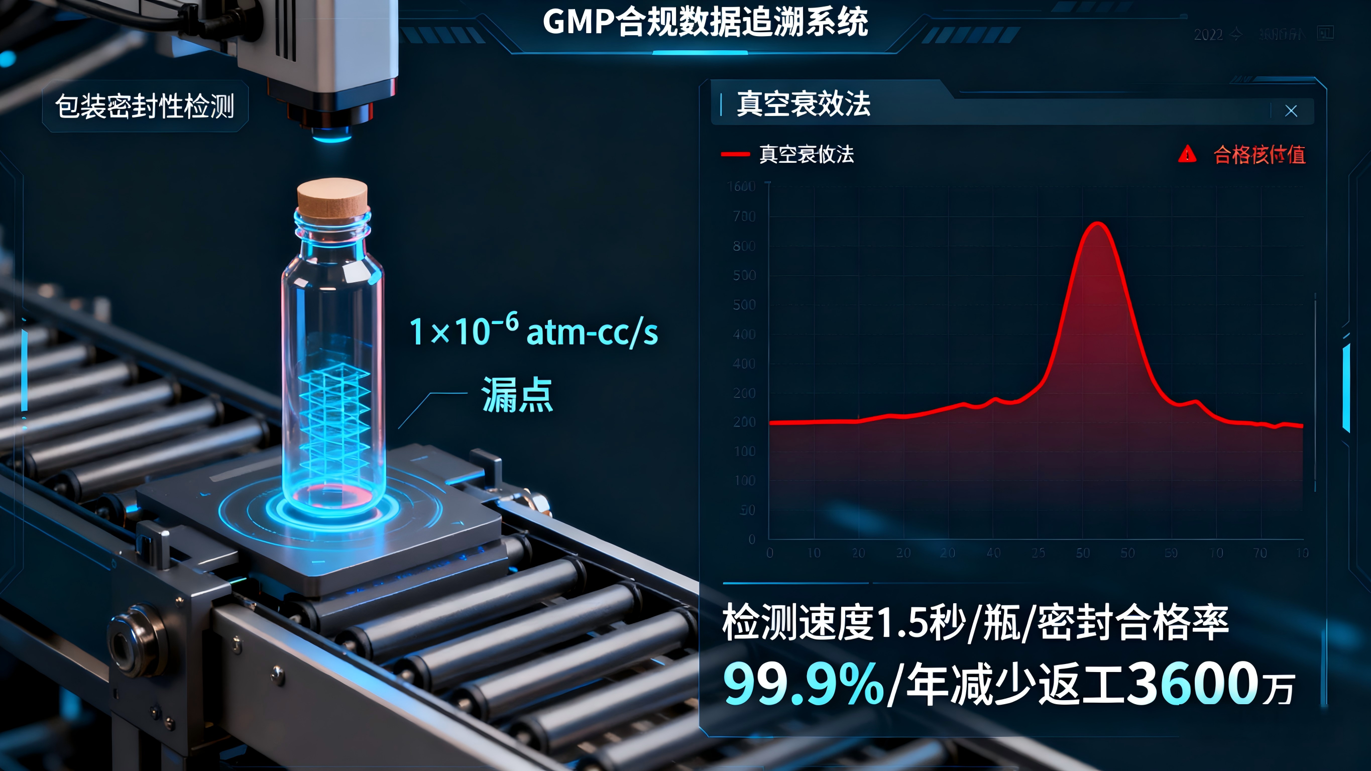痛点:人工浸水检漏 + 目视观察,微小漏点(漏率≥1×10⁻⁶ atm・cc/s)漏检率 35%,每天因密封不良导致的返工超 2000 瓶,损失超 10 万元;每瓶检测需 12 秒,无法适配量产;