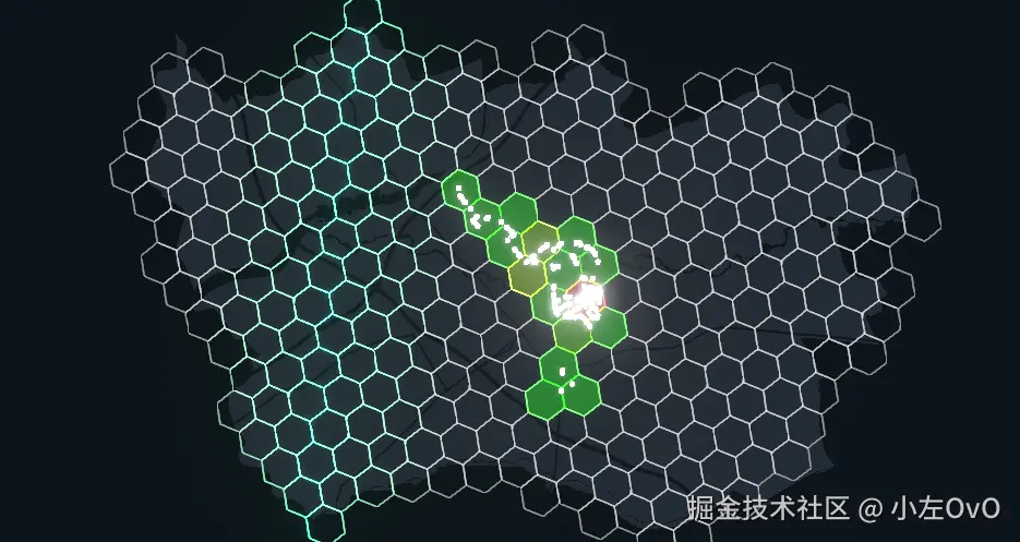 最后为所有公交站点添加发光粒子效果,能够清晰的看到站点分布在蜂窝的情况,我们使用threejs的粒子Points,并让他发光以增强效果,首先将Point位置投影到站点实际的位置 然后使用canvas为粒子创建纹理材质,最后增加亮度触发Bloom即可~