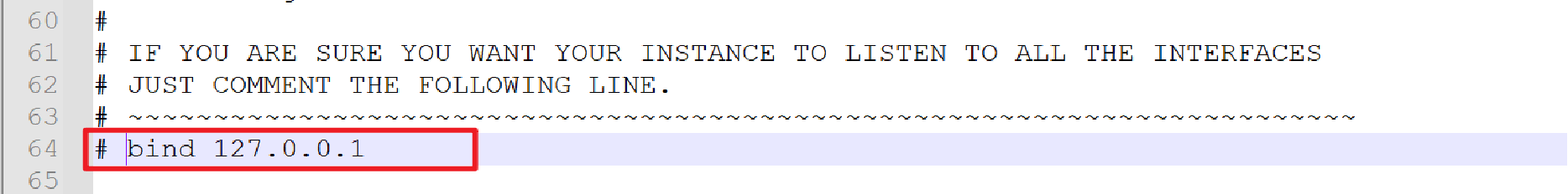 (3)默认bind 127.0.0.1 改为 直接注释掉(默认bind 127.0.0.1只能本机访问)或改成本机IP地址,否则影响远程IP连接