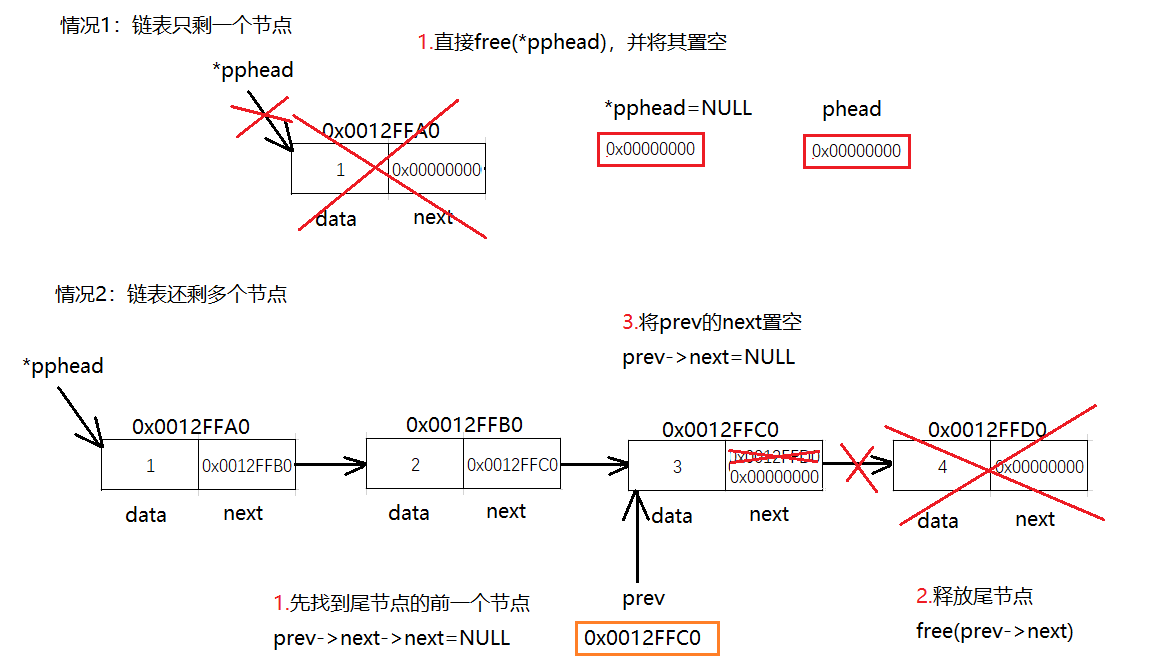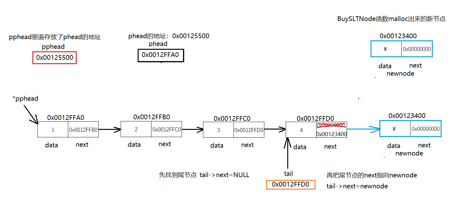 注:尾插空链表时需要改变的是phead,是一个结构体指针类型,因此传参需要传结构体指针的指针pphead。当尾插的链表不是空链表时,尾插改变的是尾节点的next,改变的是一个结构体类型,只需要结构体指针就行。