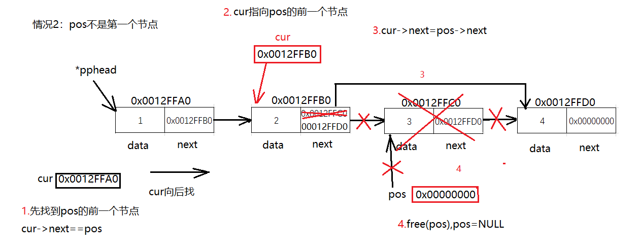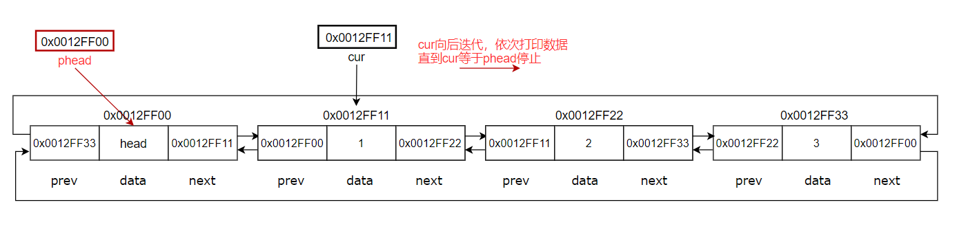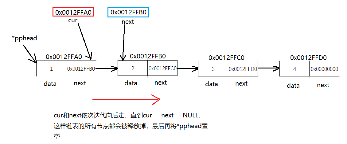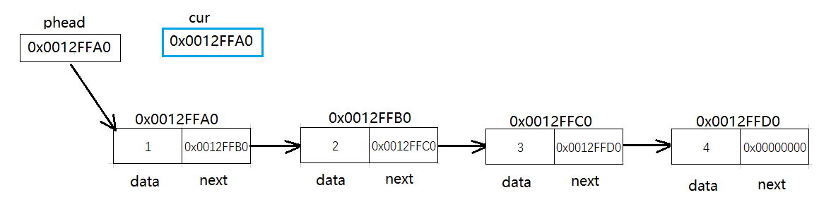 注:此处的cur是一个临时的结构体指针变量,用于存储结构体的地址,cur=cur->next相当于把cur指向的下一个节点的地址赋给cur这个临时变量,进行访问下一个节点。