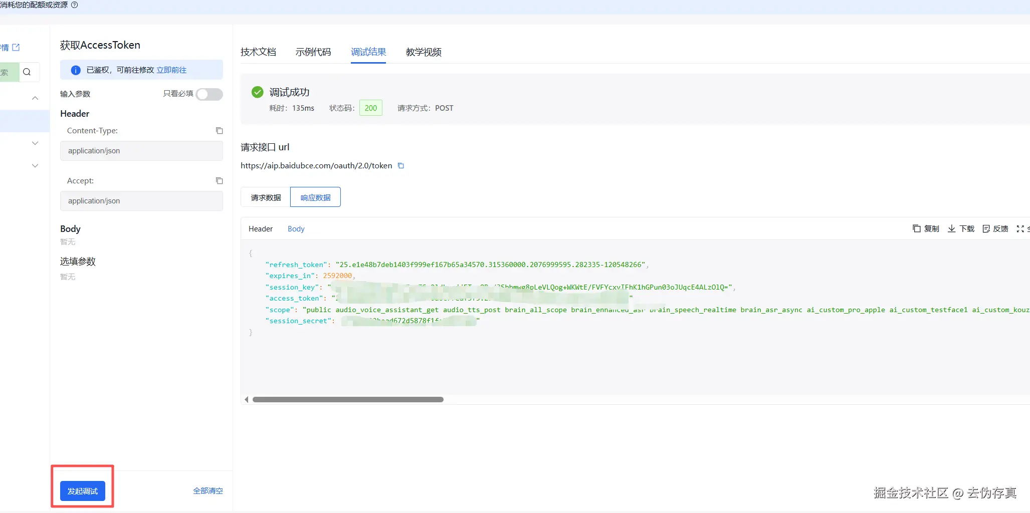 现在只想快速验证一下,并未按正常流程生成和维护access_token, 点击发起调试按钮后,会生成一个时效只有一天的访问凭证。后续上线需按正式流程获取 Token