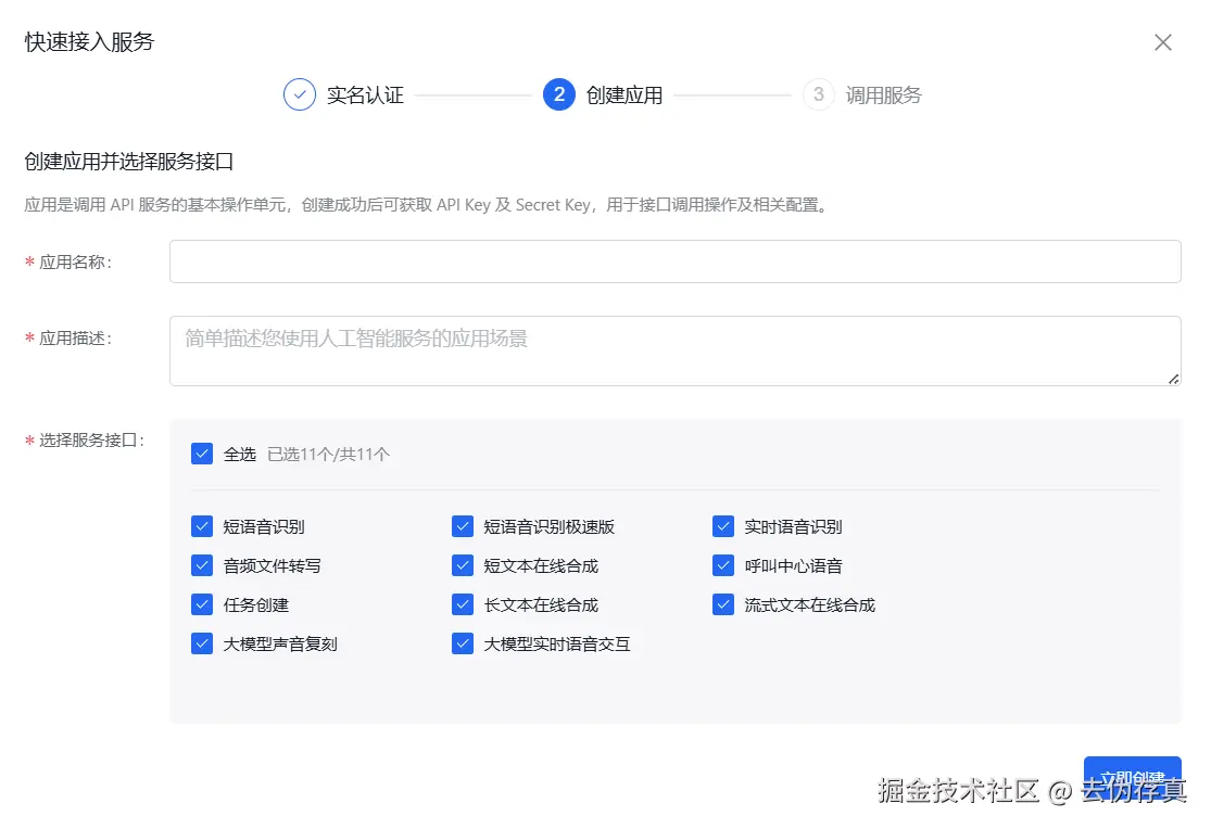 应用名称随意填写,给应用起个好记的名称。描述简单填一下。服务接口全选即可。
