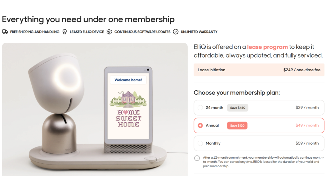 目前RaaS模式已经在国外实现较为广泛应用。情感陪伴机器人ElliQ设备与云端服务结合,采取一次性购机 + 订阅服务的模式,在订阅期内不断向老人提供娱乐陪伴、人际联系、健康养生以及日常生活协助等四大类型的服务。