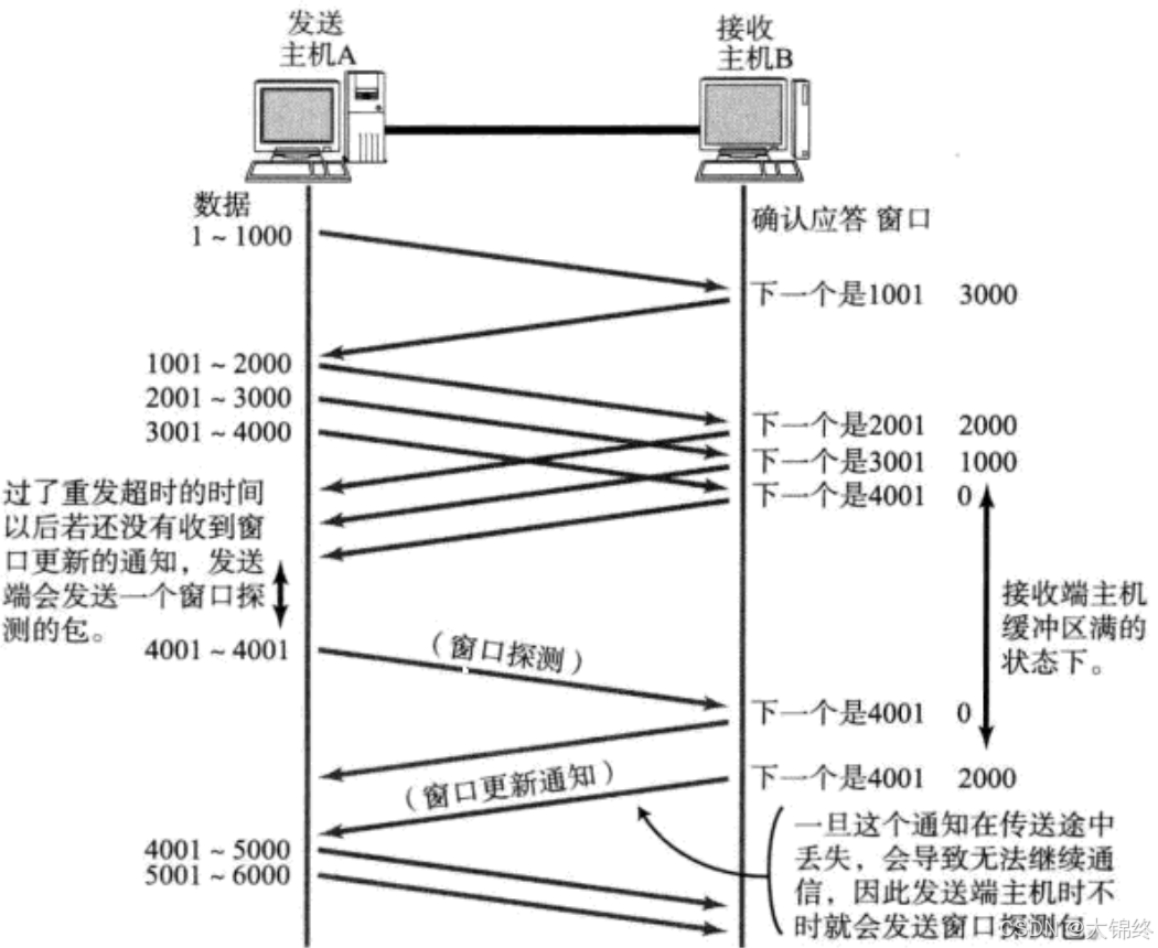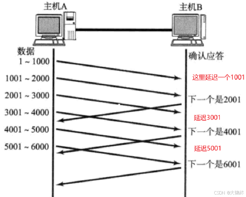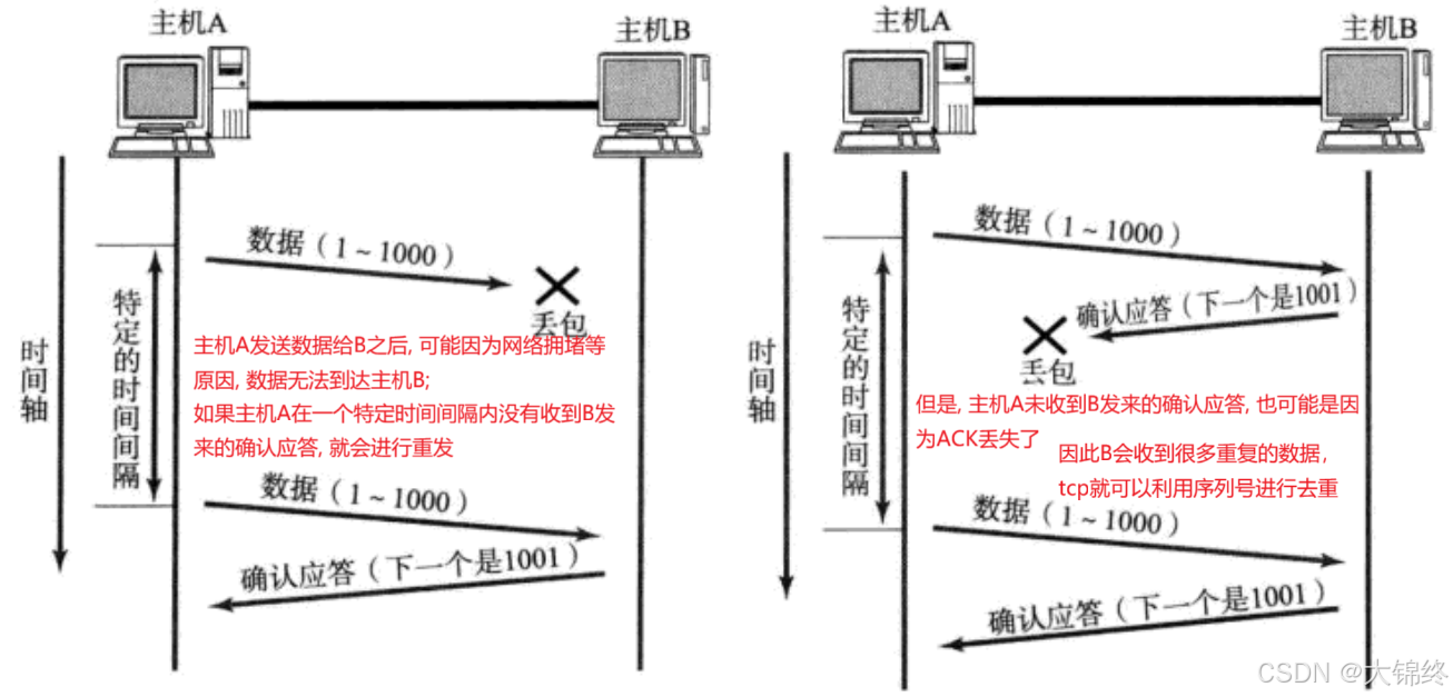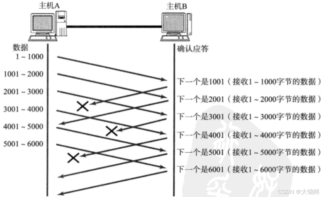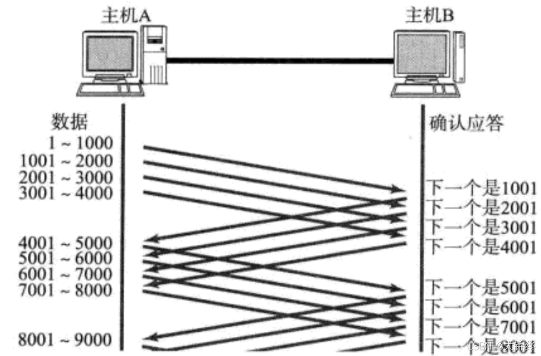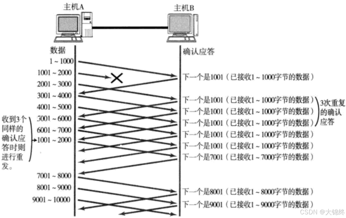 当某一段报文段丢失之后, 发送端会一直收到 1001 这样的ACK, 就像是在提醒发送端 "我想要的是 1001" 一样;如果发送端主机连续三次收到了同样一个 "1001" 这样的应答, 就会将对应的数据 1001 - 2000 重新发送;这个时候接收端收到了 1001 之后, 再次返回的ACK就是7001了(因为2001 - 7000)接收端其实之前就已