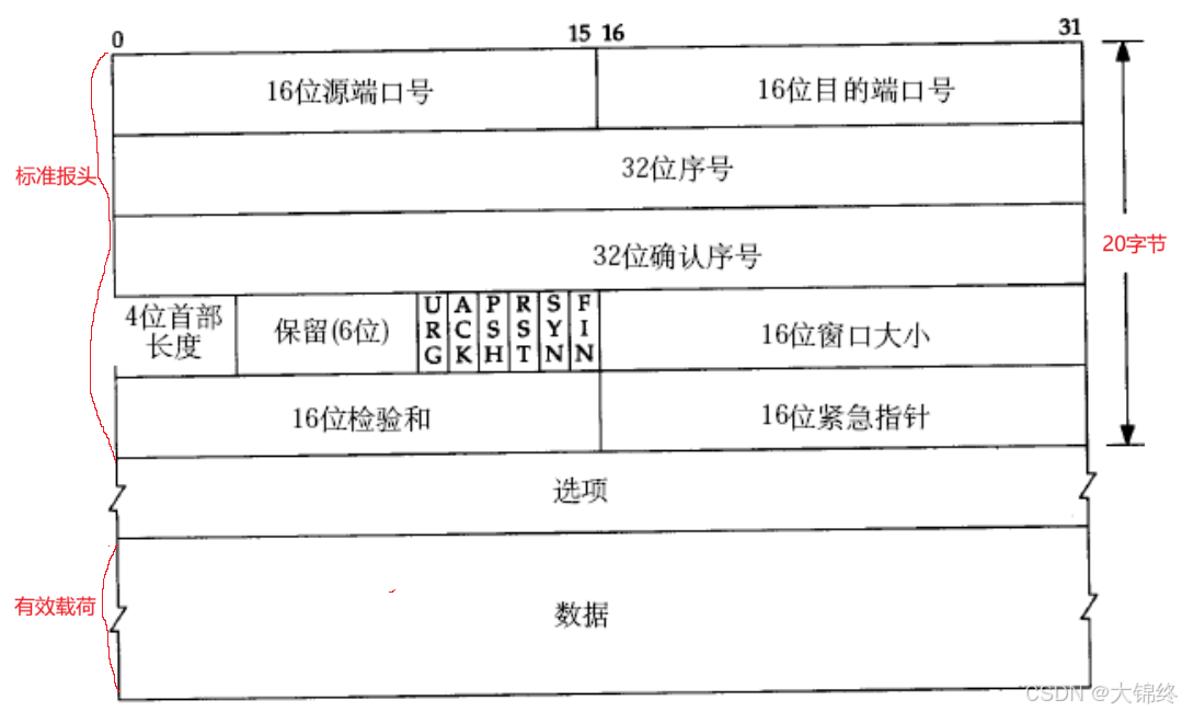 - 4位首部长度中是包含报头选项的,基本单位是字节,表示该TCP头部有多少个32位bit(有多少个4字节); 所以TCP头部最大长度是(二进制表示1111)15 * 4 = 60字节,最小长度为20字节(固定部分)