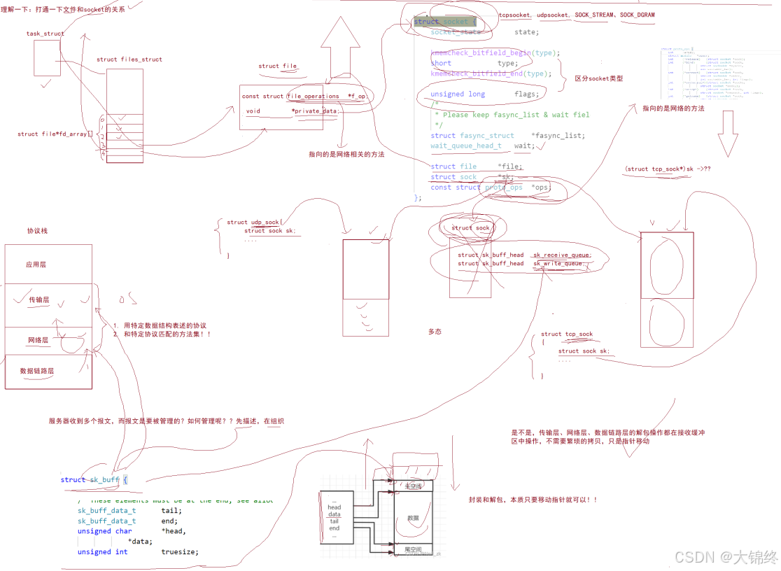 它是 Socket 的 "管理层",包含 Socket 的类型(SOCK_STREAM/SOCK_DGRAM)、状态(如连接 / 监听),以及指向传输层协议核心结构struct sock的指针。图中圈出的socket_state、type、ops等字段,就是用来标识 Socket 的网络属性(如 TCP 还是 UDP、是否已连接)