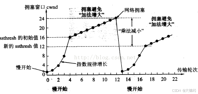 在每次超时重发的时候, 慢启动阈值会变成原来的一半, 同时拥塞窗口置回1 - 总结: