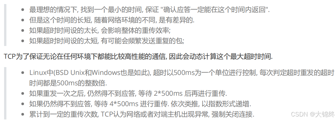 如果发送数据出现问题,不仅仅是对方主机出现了问题,也可能是网络出现了问题,通信时出现了少量的丢包tcp会判定为常规情况,如果出现大量的丢包会判定网络出现了问题,就好比一个班考试如果一个人挂科那么会认为是自己没学好,如果只有一个人及格,那么肯定不是学生的问题。网络出现问题一般是硬件设备出问题,或者数据量太大引起阻塞。tcp可通过自身的可靠性机制(重传、确认)和拥塞控制机制,主动适应并尽可能在逻辑通信层修复网络问题,当然,TCP 的能力是有限的(比如无法直接修复物理链路故障),网络的物理维护(如光纤、路由器故障)需要专业人员 - 当通信双方都出现了大量的数据丢包问题,tcp会判断网络出问题了(拥塞了),发送方就不能对报文进行超时重发,这样会加重网络的拥塞状态,因为网络资源是共享的,有很多主机在同时连接使用,如果每台主机都这么想那么可能导致网络直接瘫痪。TCP 协议通过 "以丢包为拥塞信号,统一执行降速行为" 的机制,让多台主机在网络拥塞时形成了 "共同应对策略"(共识),从而避免网络因无序竞争而崩溃,保障了互联网的可扩展性和稳定性。