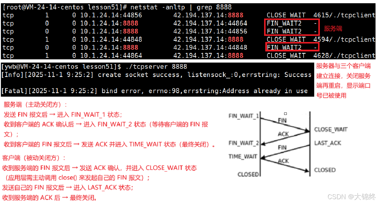 当一台服务器和一个客户端进行通信时,可能是因为服务器正在执行一个周期长的任务或者资源不足导致卡顿,不回信息但是又没挂掉,客户端想要知道到底什么情况,如果发送普通信息就会进入服务器的接收缓冲区等待,等待历史发过的信息响应完后才到这条,那就没意义了,所以这种情况下想要立即返回就需要发送带URG紧急指针标记位的报头,服务器需要提供读取紧急数据+软件功能提供状态编号,才能支持读取紧急数据,紧急数据在应用层称为带外数据,应用层读写时send或recv接口中MSG_OOB选项代表应用层支持读取紧急数据 - FIN(finish) : 通知对方, 本端要关闭了