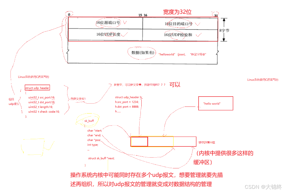 16位UDP长度, 表示整个数据报(UDP首部+UDP数据)的最大长度;如果校验和出错, 就会直接丢弃;也就是说一个UDP能传输的数据最大长度是64K(包含UDP首