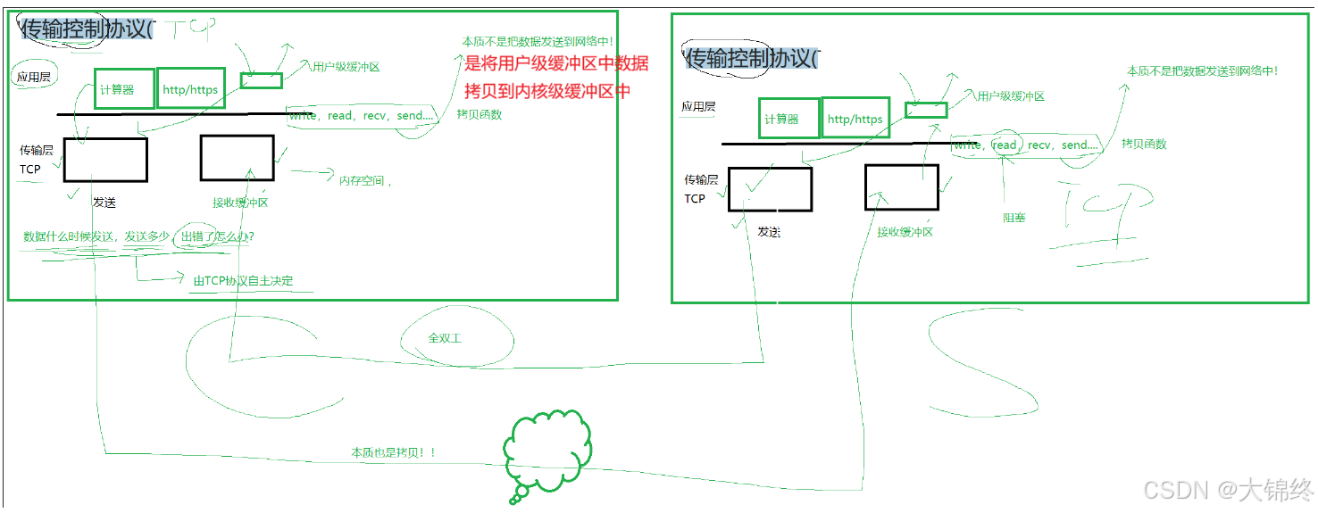 - 具有传输控制协议的原因就是具有发送缓冲区,应用层将数据交付下来后任务就完成了,后续工作与其无关,先将数据写入发送缓冲区中,什么时候发送由操作系统自主决定