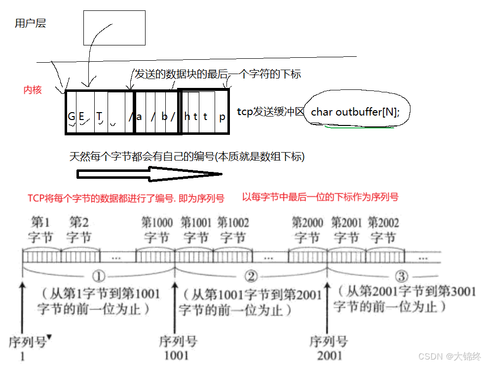 序号的生成逻辑:序号=基准值+数组下标,因为每一对连接内核都会为其维护一对tcp缓冲区,基准序号是发送缓冲区中第一个字节的TCP序号,数组下标代表缓冲区中数据的相对位置。
