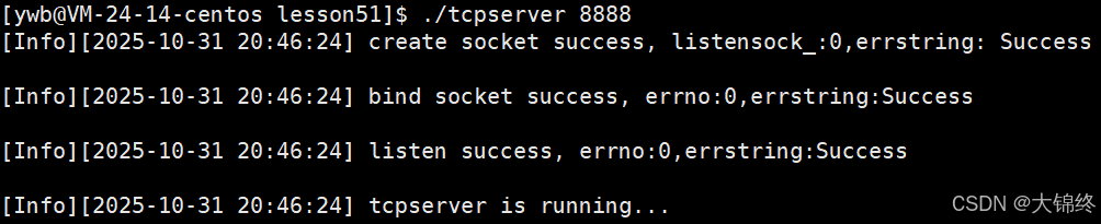 使用的是Linux中lesson51的代码,只更改了TcpServer.hpp中部分,简化代码,只初始化套接字、绑定和打开监听状态,start中不使用accept来获取新连接