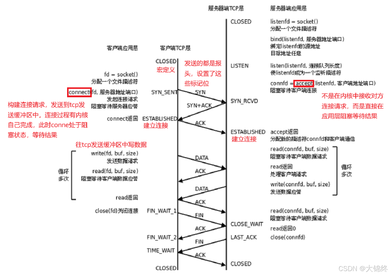 UDP就完全不同,面向数据报,发送一次就必须对应接收一次, - tcp协议在内核中实现,应用层用户调用write接口将数据写入tcp的发送缓冲区,剩下的发送控制全权由tcp负责,用户可能write了多个请求,但是tcp只认识多个字节数据,将多个请求都看成一串字节数据,tcp不关心上层协议,不关心上层报文格式,只有字节的概念
