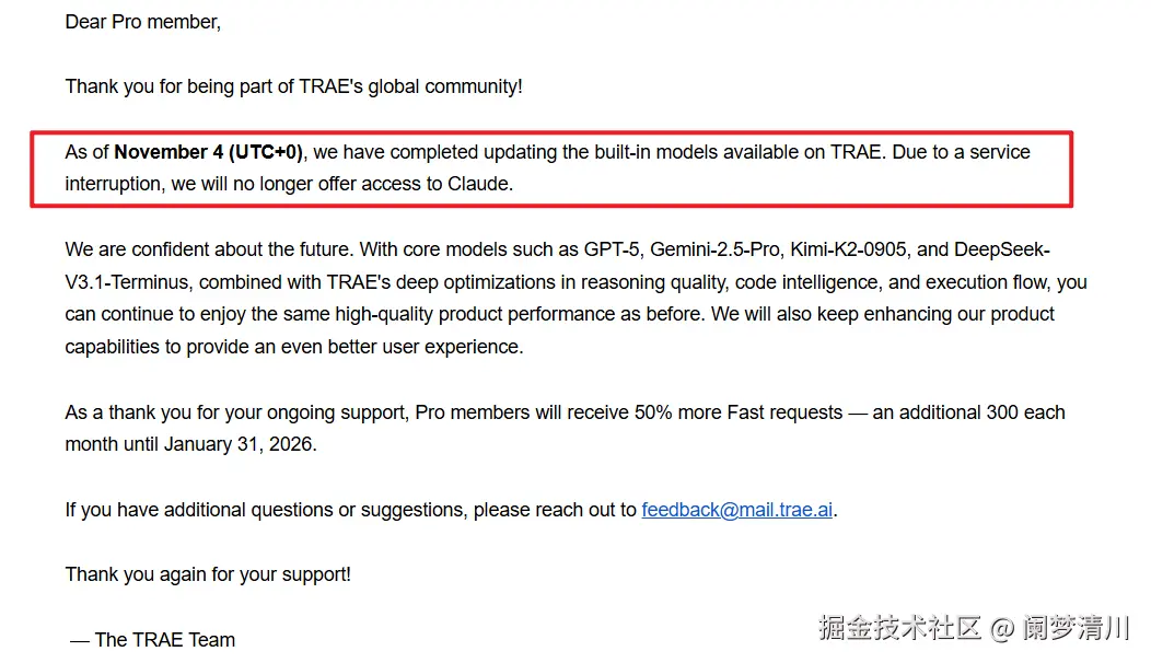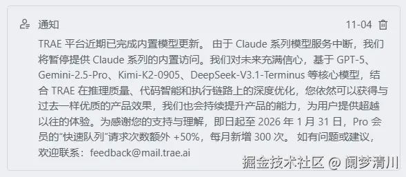 今天,最开始是在trae上面看到的,claude停掉了这个trae的服务,也就是说,订阅trae的用户,后续无法调用claude相关的大模型;