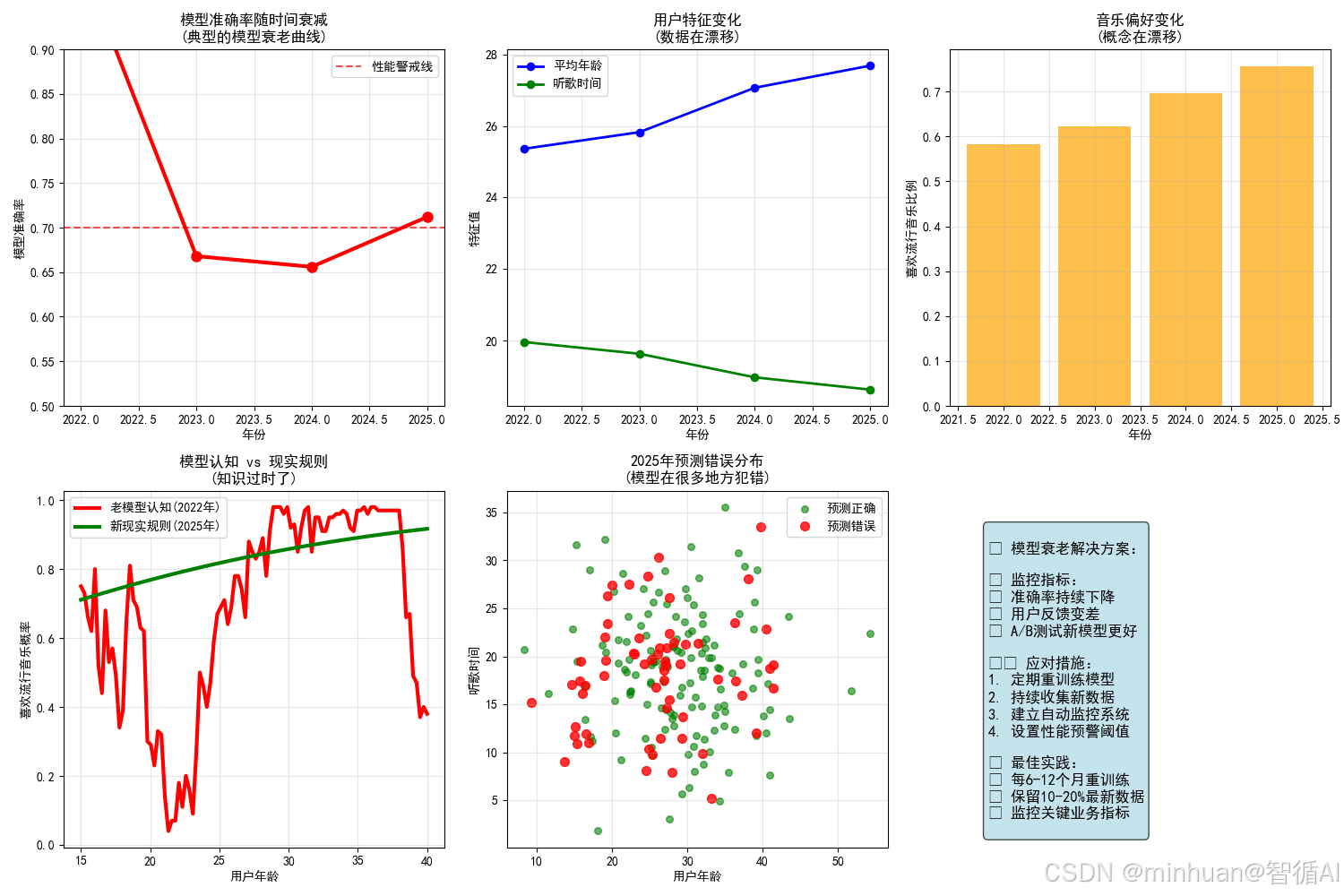 **简单理解:**如同人类的专业知识会过时,好比医生毕业多年后,医学知识没有更新,诊断方法变得过时,通常表现为模型的预测准确率随时间推移逐渐下降
