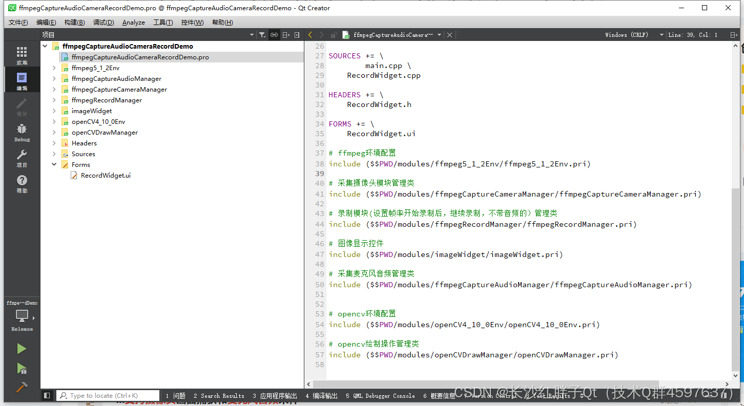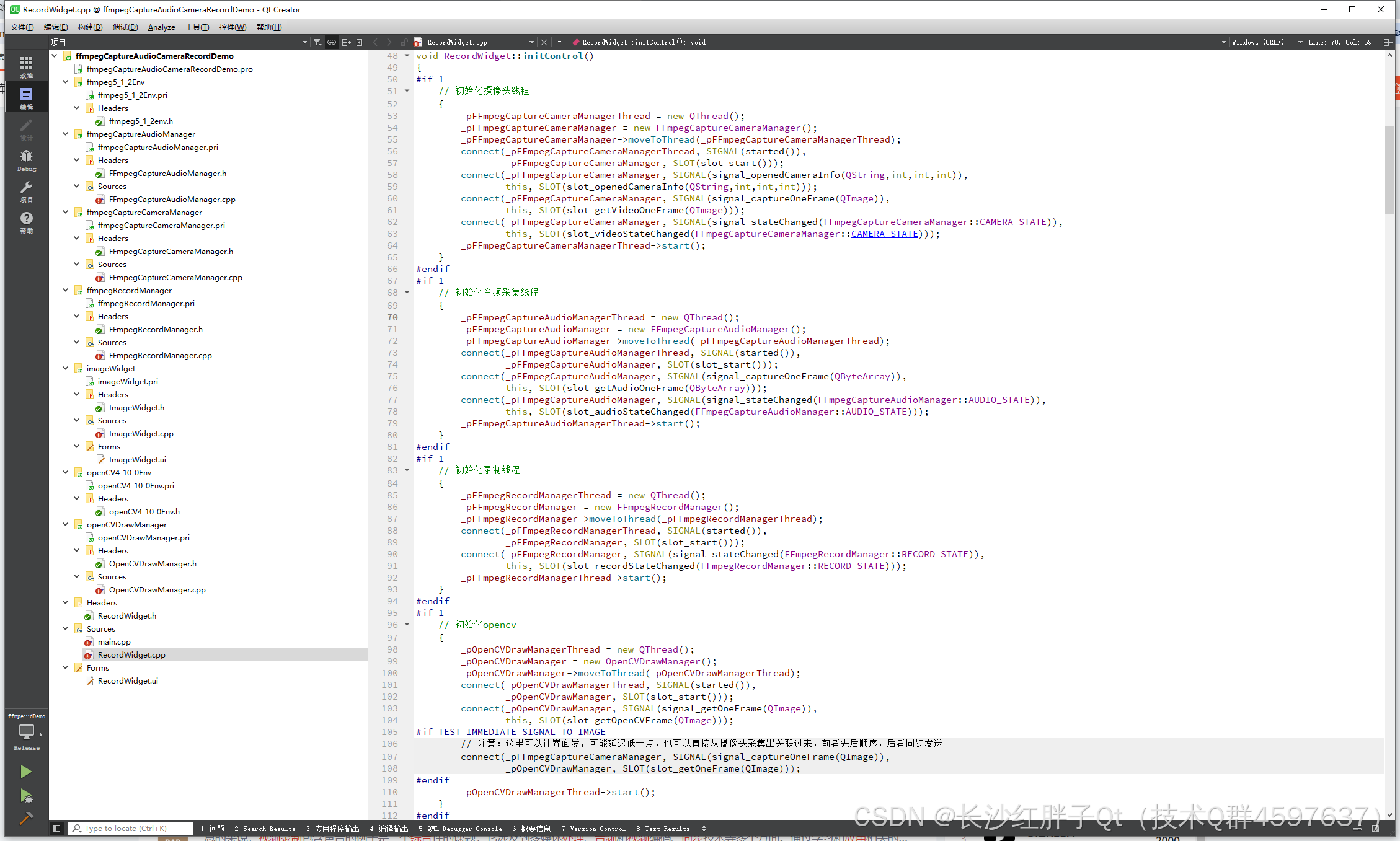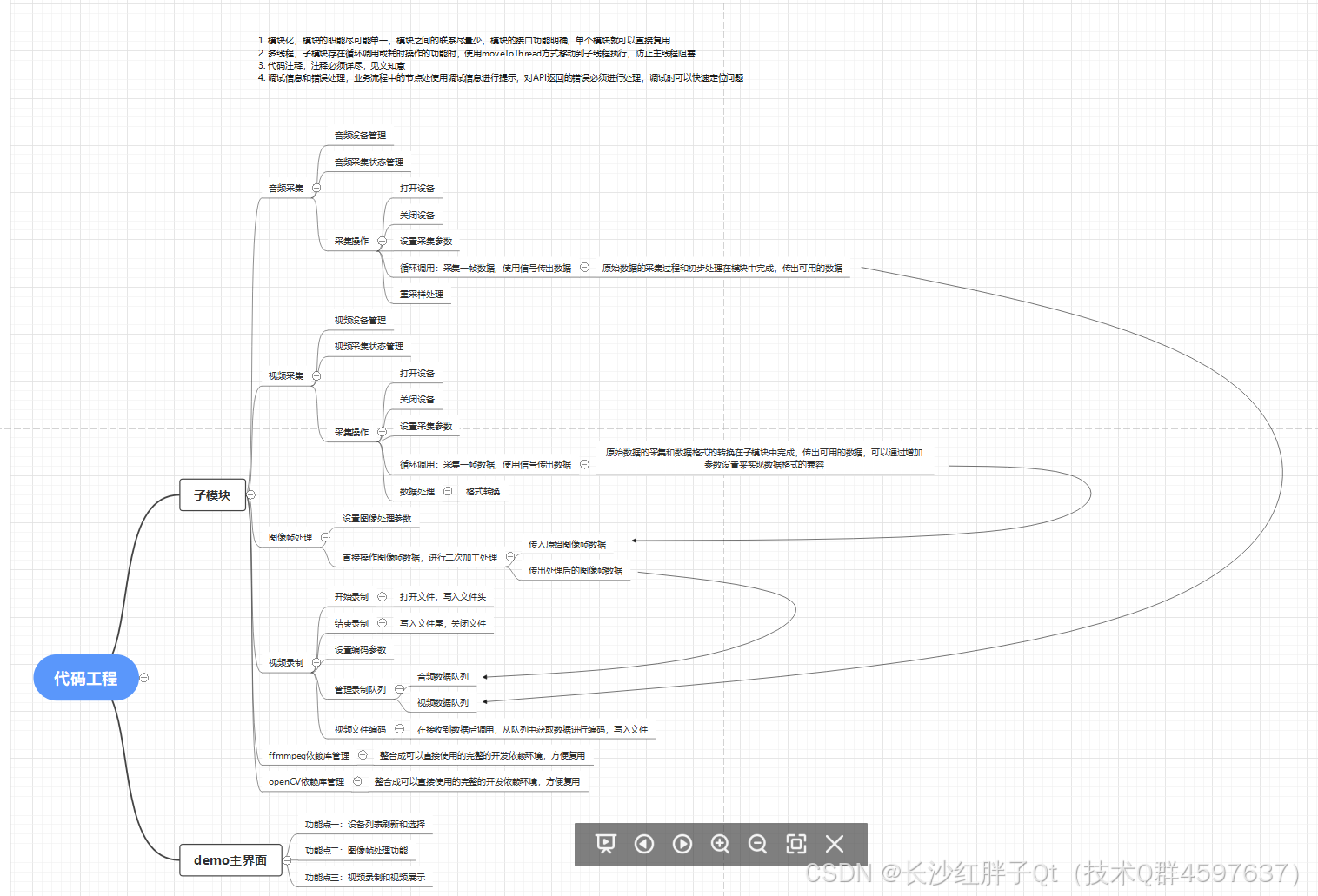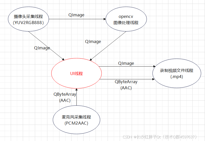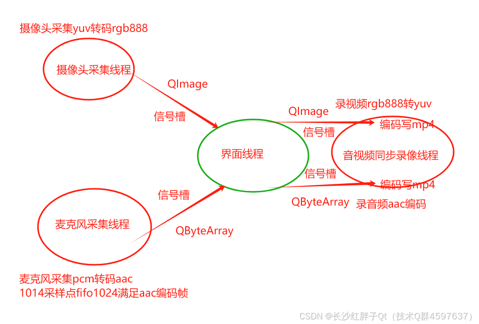 与传统的录音录像有较大的不同,既可以实现录音录像又兼容了Qt信号槽的低耦合高内聚思想,让对音频和视频的处理可以通过中间信号槽环节,只要输出信号的数据类型和处理后接收的信号类型数据一致,至于中间怎么处理,可以模块内自行任何处理,但是延迟不应该太长,比如几十ms几百ms即可。(这里有个预期风险点 :算法时间,当前也就几十ms,时间未作较长延迟测试,因为ffmpeg音视频录像会有函数校准流数据中的帧位置进行调整,可能存在偏差较大无法校准的状态,单视频、单音频无此问题,多流录制文件是录制音视频同步的核心关键技术点 ,可以假设音频录制到第10s,图像再传入第4s的,从感觉上来说不太合适,从音频10s的地方修改数据到音频第4s数据处然后插入视频4s的包,调整长度达到6s,暂未论证)。