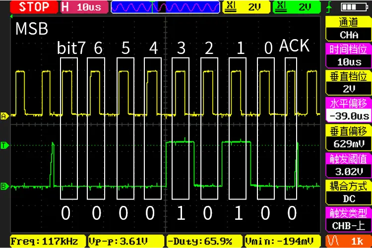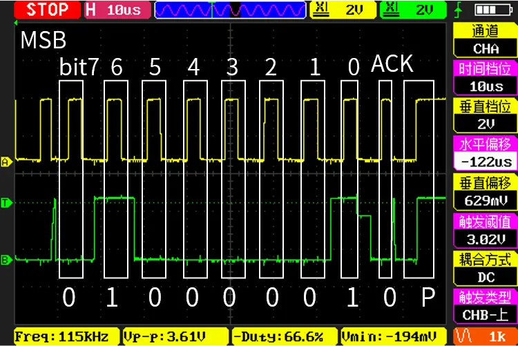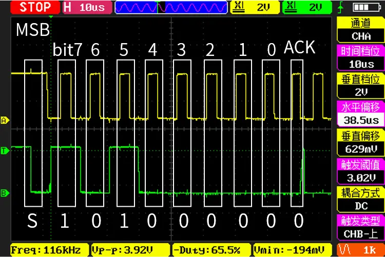 这里传输的就是数据内容,通过波形分析,传输的数据为 0x41。'A'的ASCII 码值就是 0x41,发送与实际一致。随后便是从机的应答信号,低电平表示应答,最后便是经典的P停止信号,在SCL线为高电平的时候,数据线从低电平往高电平跳变。以上就是分析IIC波形图的过程。