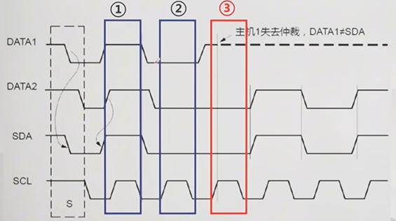 此时,如果有两个设备同时竞争总线,率先拉低的设备会获取总线的控制器,如下图所示,DATA1在 ③ 阶段的总线 被 DATA2 拉低了,此时便失去了仲裁,不再发送数据。