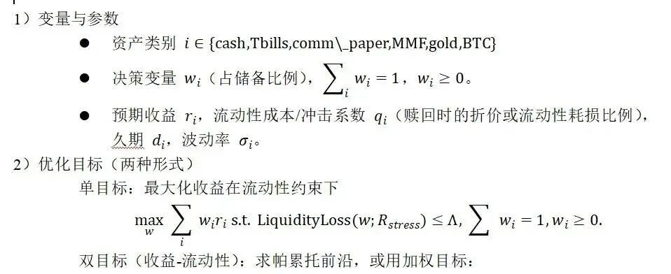 问题简介:针对锚定美元/港币的法币抵押型稳定币,在现金、短期国债等多类资产中,平衡流动性风险(应对赎回)与收益性(提升利润),设计最优配置方案,解决"多目标冲突(风险-收益)+ 约束满足(流动性覆盖)"的资产配置问题。