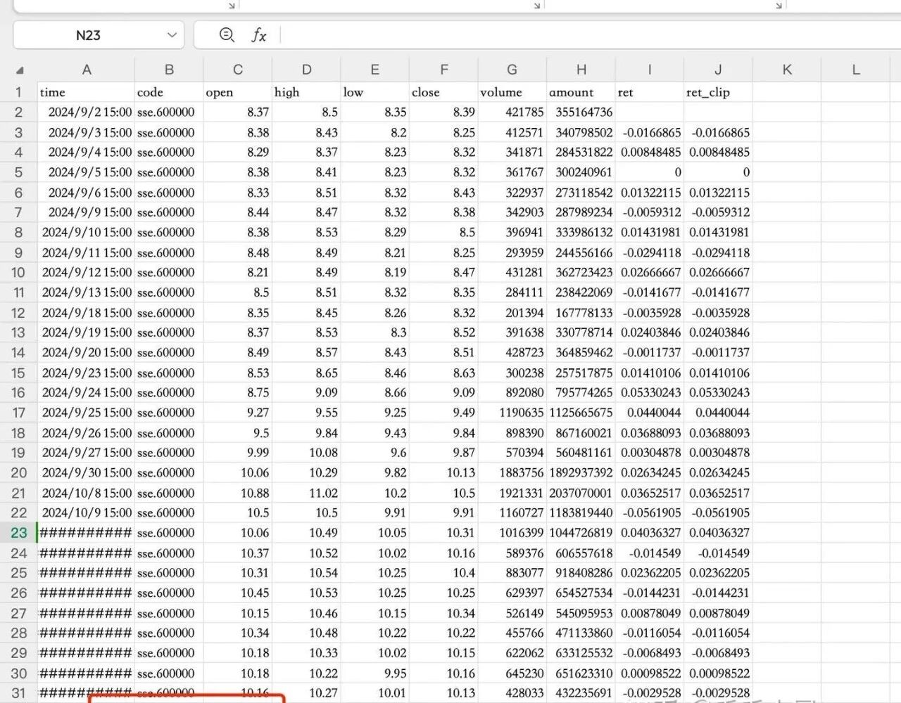 为了避免后续聚合出错,去除关键列缺失的记录,尤其是close 缺失的观测。随后进行基本合理性校验,例如剔除非正价格(open/high/low/close <= 0)与区间不一致的行(low ≤ open/close ≤ high 不成立),并对成交量、成交额的负值或极端异常做保守处理(将负值视为缺失并丢弃该行;对出现异常的大额"脏点",在无权威修正信息时建议剔除)。