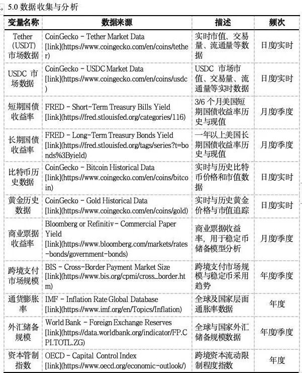 ·风险识别模型:逻辑回归(因变量为"是否放弃主权",自变量为稳定币普及度、通胀率等)、随机森林分类(处理非线性关系,如高通胀+高稳定币普及的叠加风险);