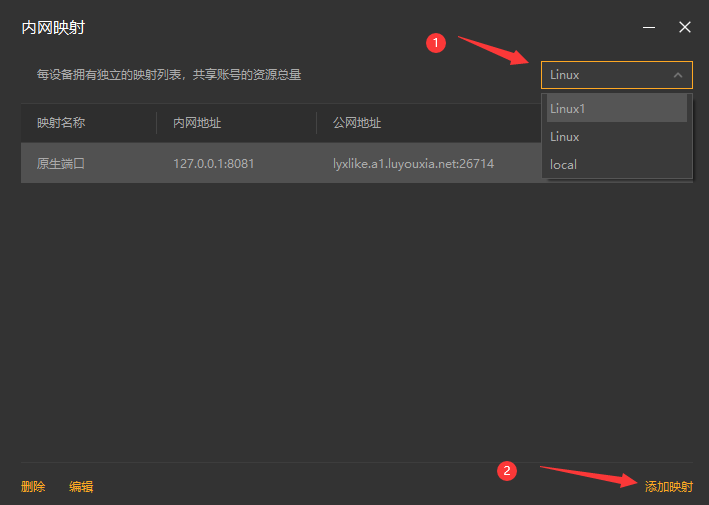 8,注意右上角的设备名称下拉框,这里选中刚刚添加的设备名称,此时在这个界面上添加的映射,就属于刚刚这个设备。容器中的路由侠进程就会更新并加载。切换好设备后,点击【添加映射】。