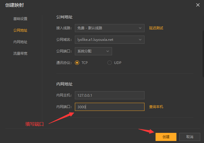 10,在内网端口里填写端口 3000 后点击【创建】按钮,如下图。