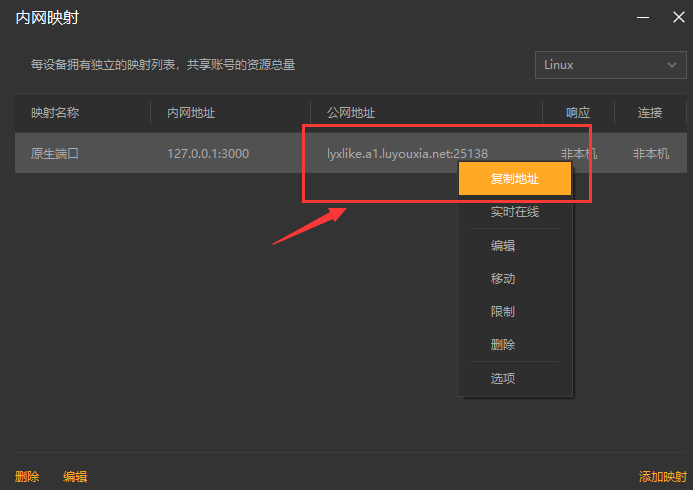 11,创建好后,就可以看到一条映射的公网地址,鼠标右键点击【复制地址】。