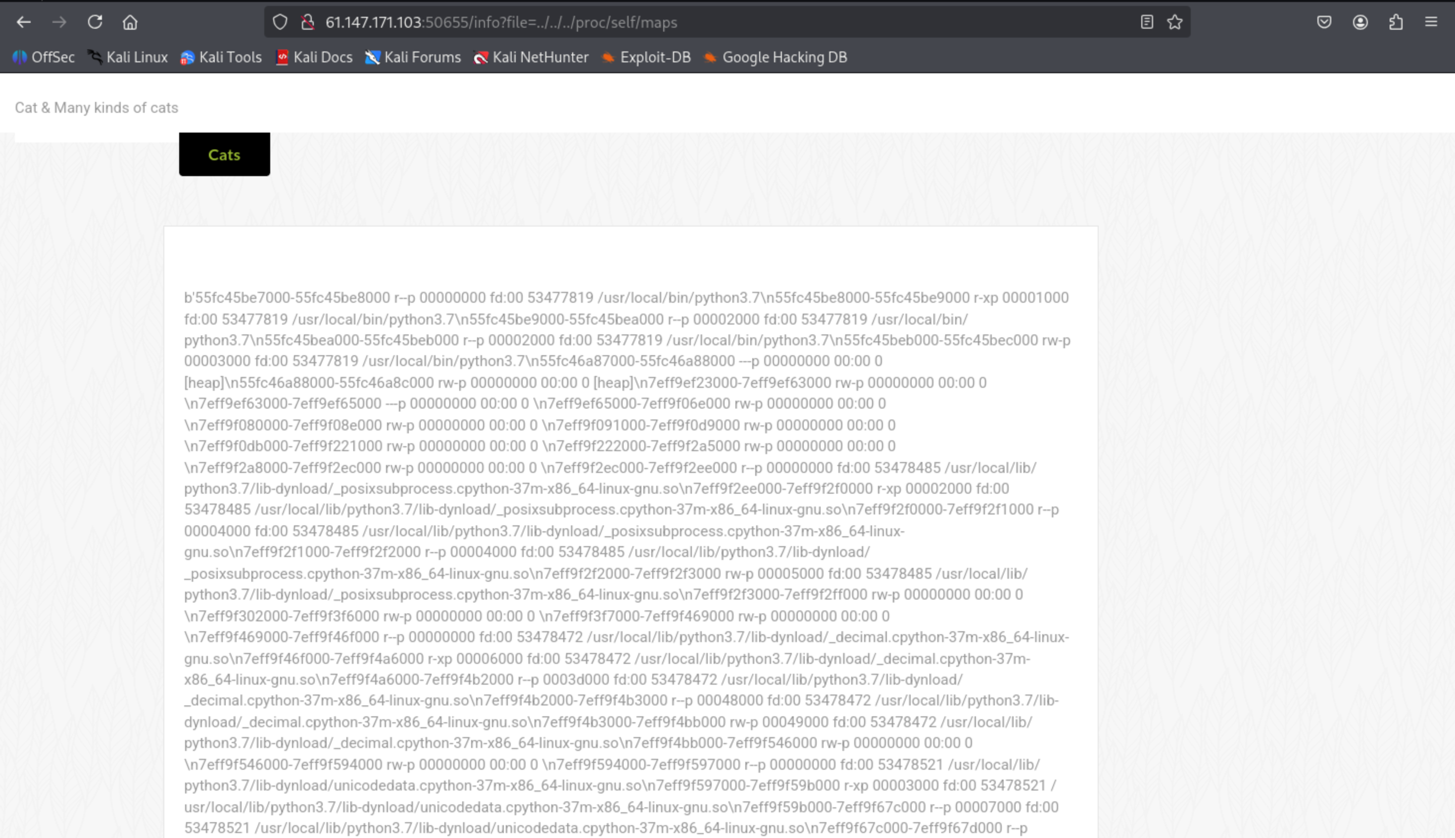 读取当前进程的命令行参数?file=../../../../proc/self/cmdline,发现有一个通过python启动app.py的命令,所以该网站是一个python框架。根据app.py可以知道是flask框架。(该文件常常为flask项目结构中的主程序文件。)