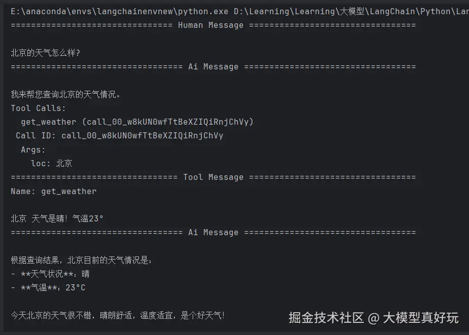 - ToolMessage:工具消息,封装了函数调用结果的相关数据,显示工具调用的执行结果。