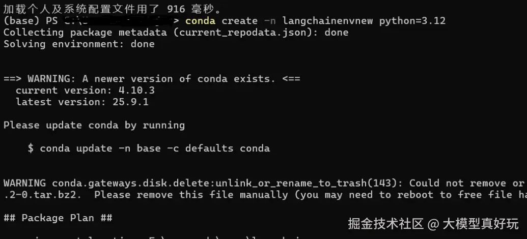 LangChain 1.0 的环境搭建过程较为简单。笔者推荐使用 anaconda 创建一个新的虚拟环境(这里命名为 langchainenvnew),并建议将 Python 版本设置为 3.12 。创建环境的命令如下: