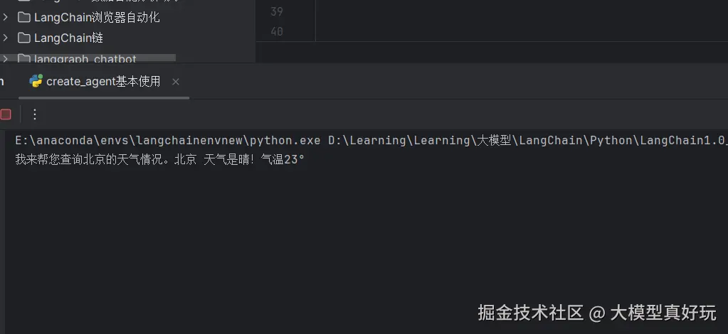 pythonfrom langchain.chat_models import init_chat_model from langchain.tools import tool from langchain.agents import create_agent @tool def get_weather(loc:str)->str: """ 根据地点参数可以返回该地点的天气情况 """ return f"{loc} 天气是晴!气温23°" -