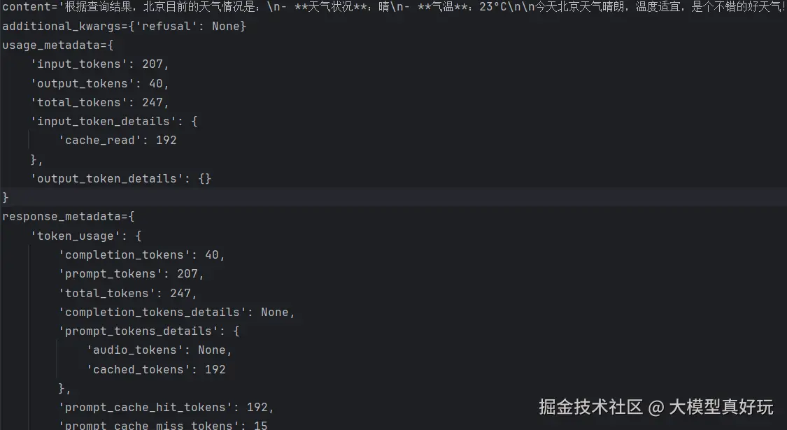 查看输出的最后一条消息,可以看到 messages 消息列表中返回了详细的内容结构:其中content是模型的主要输出内容,usage_metadata包含了输入输出token的使用量统计,response_metadata包含了更详细的输入输出信息包括令牌使用,模型提供商,模型名称等。这些丰富的元数据为开发者监控智能体行为、优化性能和分析成本提供了宝贵的信息基础。