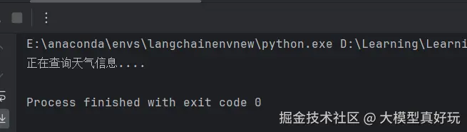 首先导入代码所需依赖,并通过自定义函数的方式编写一个模拟天气查询函数,注意工具函数必须包含清晰的函数说明,这是大模型判断是否调用自定义函数的重要依据。从依赖包的导入方式大家可以看出langchain的依赖包命名更加简洁明了。