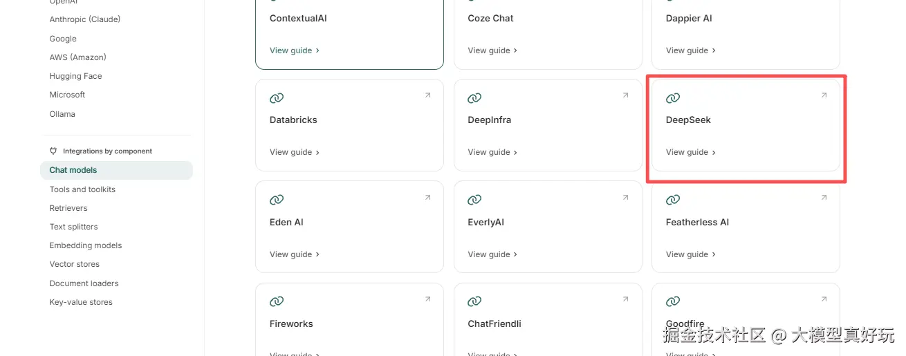 在上述代码中,笔者使用了 DeepSeek 模型。LangChain 1.0 已经集成了超过 100 个模型供应商 ,为开发者提供了极大的灵活性。不同模型的具体使用方法都可以在 LangChain 官网的 Chat 模型集成页面 找到详细的文档说明,包括我们上面使用的DeepSeek 模型配置方法: