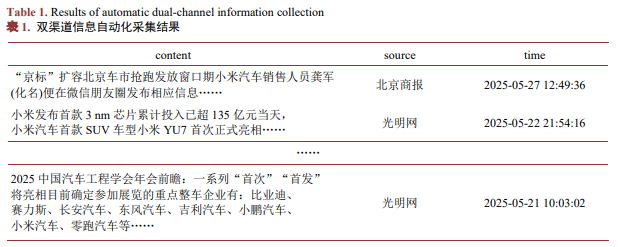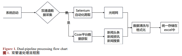系统通过两个渠道进行采集舆情数据,将光明网和Coze平台获取的新闻内容、来源及时间等关键信息统一整合至DataFrame数据结构中,并最终导出为Excel文件(如表1)。均能稳定获取舆情监测所需的核心字段(内容、来源、时间),完全满足目前的舆情监控工作的基础需求。爬取的新闻数据可以自主地选择下载的路径。