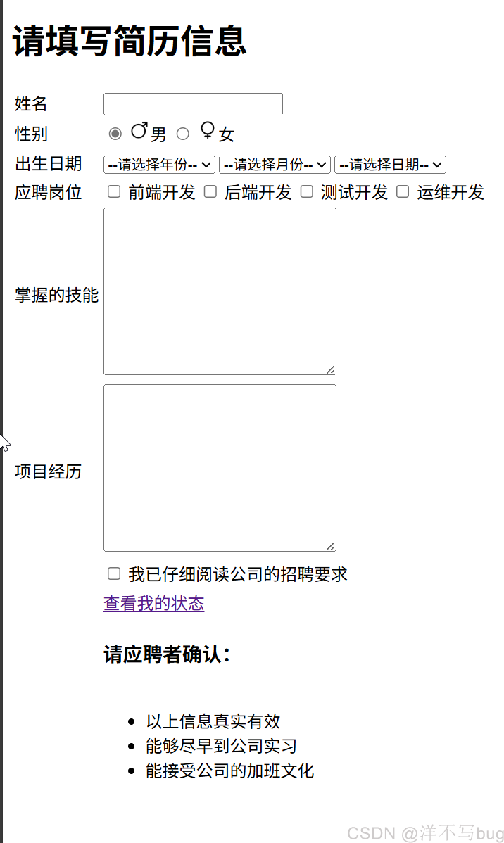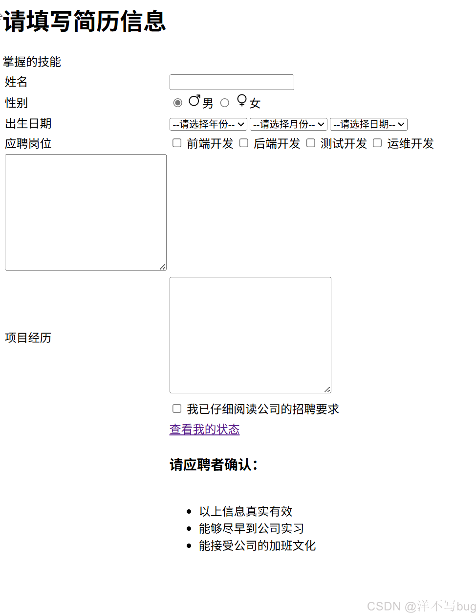 上篇制作个人简历的博客主要练习的是一些基础标签和列表,这篇博客会通过制作简历填写页面来练习用表格来进行排版,以及表单标签各种属性的使用,label标签的优化等,增加对这些知识掌握的熟练度