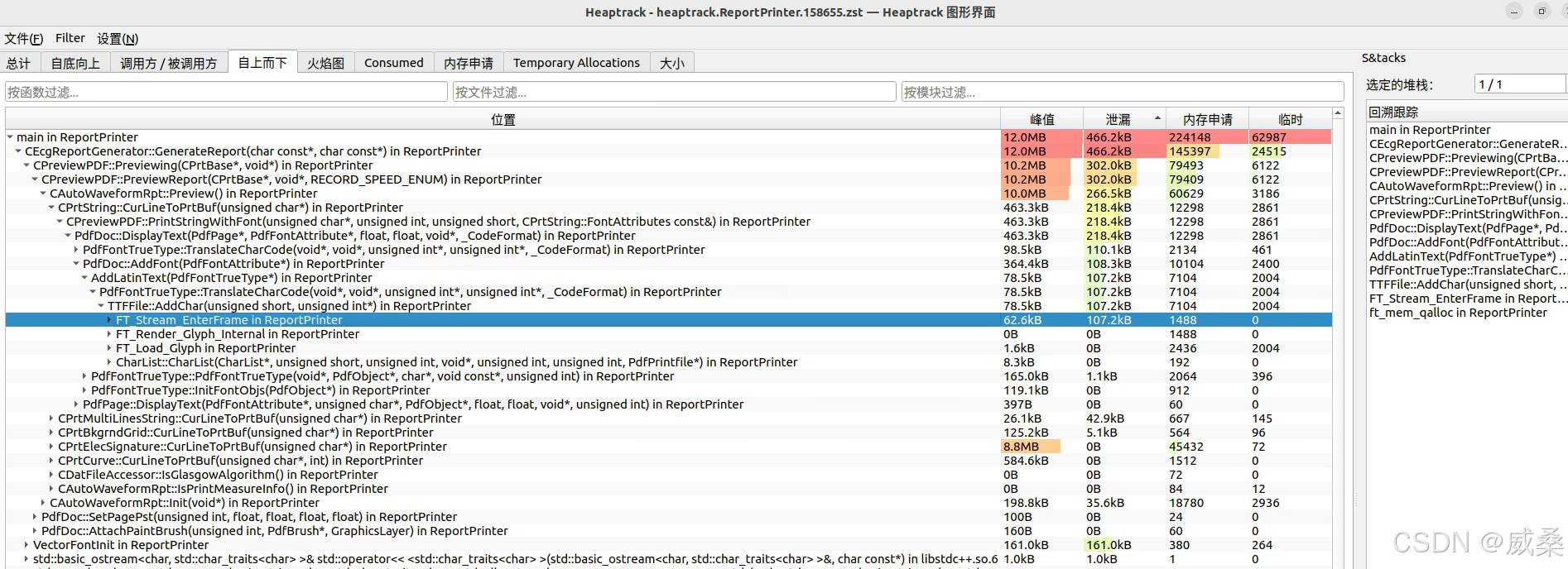 Heaptrack 是一个内存泄漏跟踪工具,它能够跟踪程序中所有的堆内存分配,并且帮助你定位内存泄漏问题。它记录了每次分配和释放堆内存的位置,最后生成一个 火焰图,帮助分析。