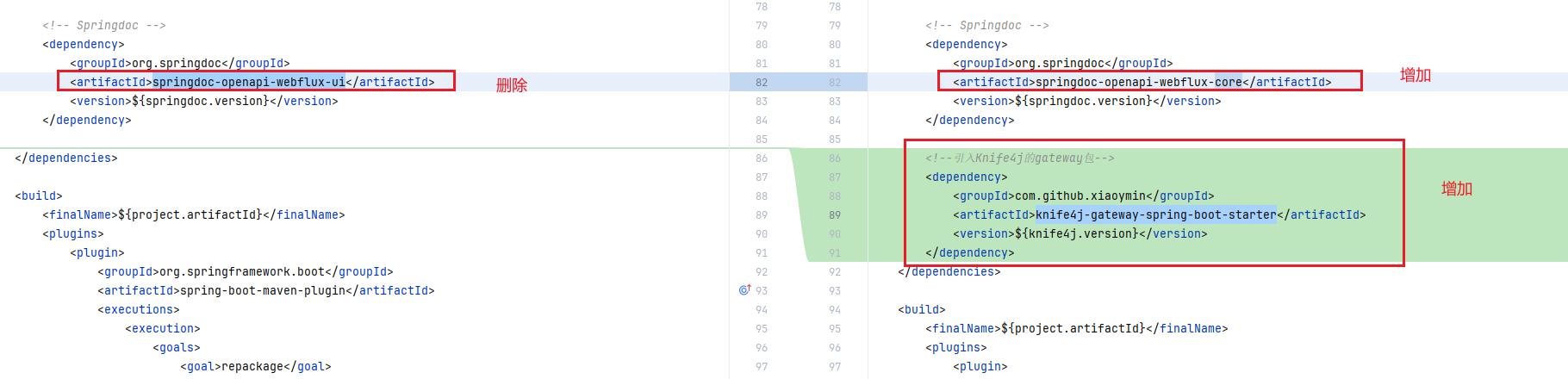 3.gateway服务的pom中删除 springdoc-openapi-webflux-ui 依赖,增加 springdoc-openapi-webflux-core依赖 和 knife4j-gateway-spring-boot-starter
