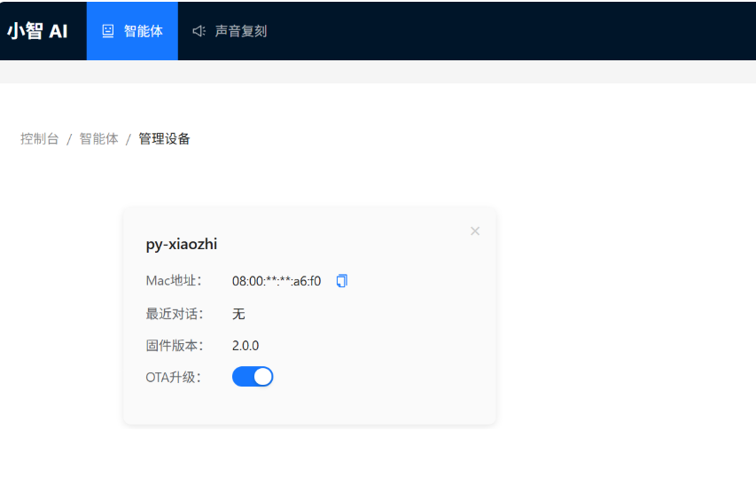首次在设备上运行程序,会根据设备信息生成一个6位的注册码,使用注册码登录https://xiaozhi.me/注册添加设备。