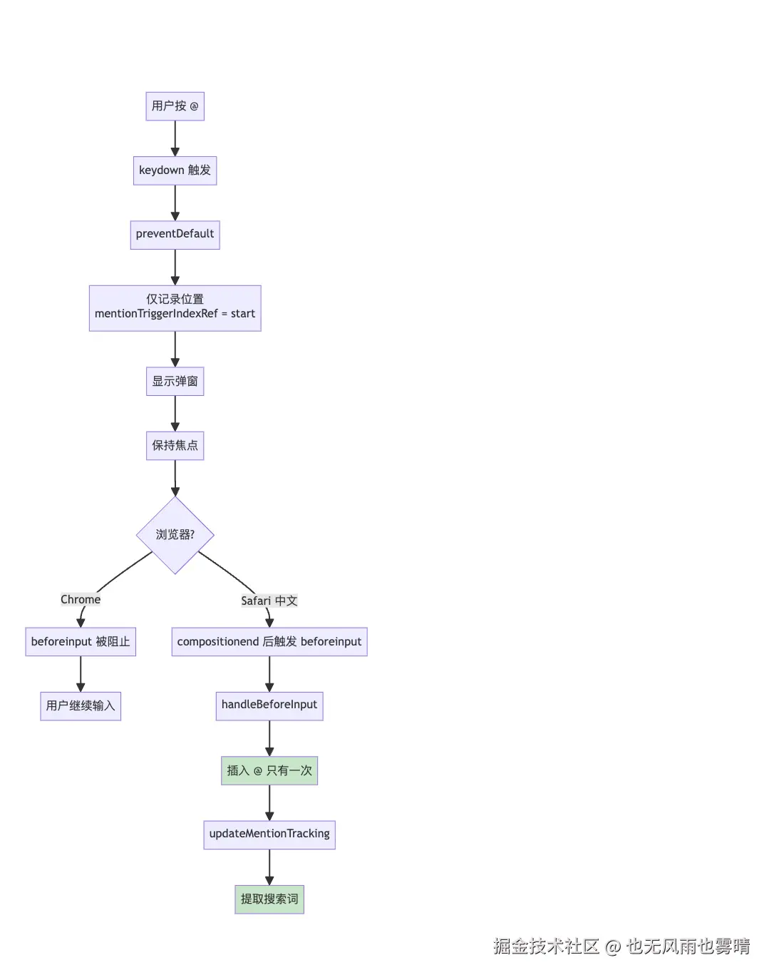 所以即使是 @,中文输入法也会走完整的 compositionstart → compositionend 流程。