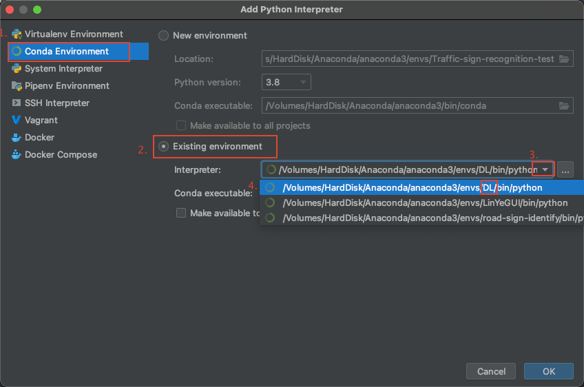 Anaconda环境,这里为DL环境,然后选择,点击OK: