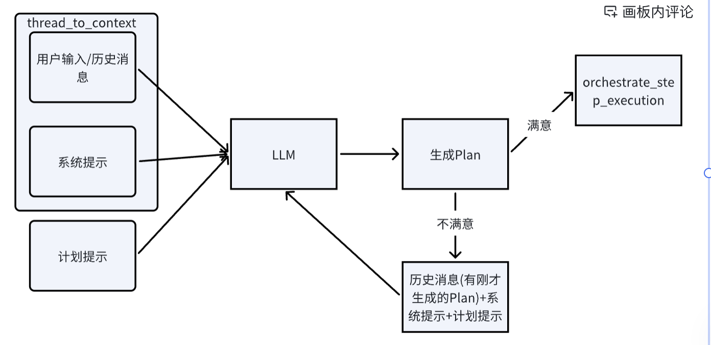 编排器的orchestrate_step_planning这个方法就是依据用户的输入,和用户进行多轮对话,产生一个计划的方法。首先是将聊天消息ChatMessage转变为LLMMessage,这个过程发生在thread_to_context中,这个方法首先是添加一个系统提示,在计划行为中这个系统提示的作用是判断是否需要计划以及生成结构清晰的计划。这个提示词需要 AI 判断用户的请求是否缺少信息,以及用户的问题是否可以从对话历史中回答,如果是这样的话,那么就提供答案,以及将need_plan设置为false,否则的话就应该制定一个计划。对于制定计划而言,那么就是对标题和详细步骤的要求。计划提示则是要求返回的JSON格式。
