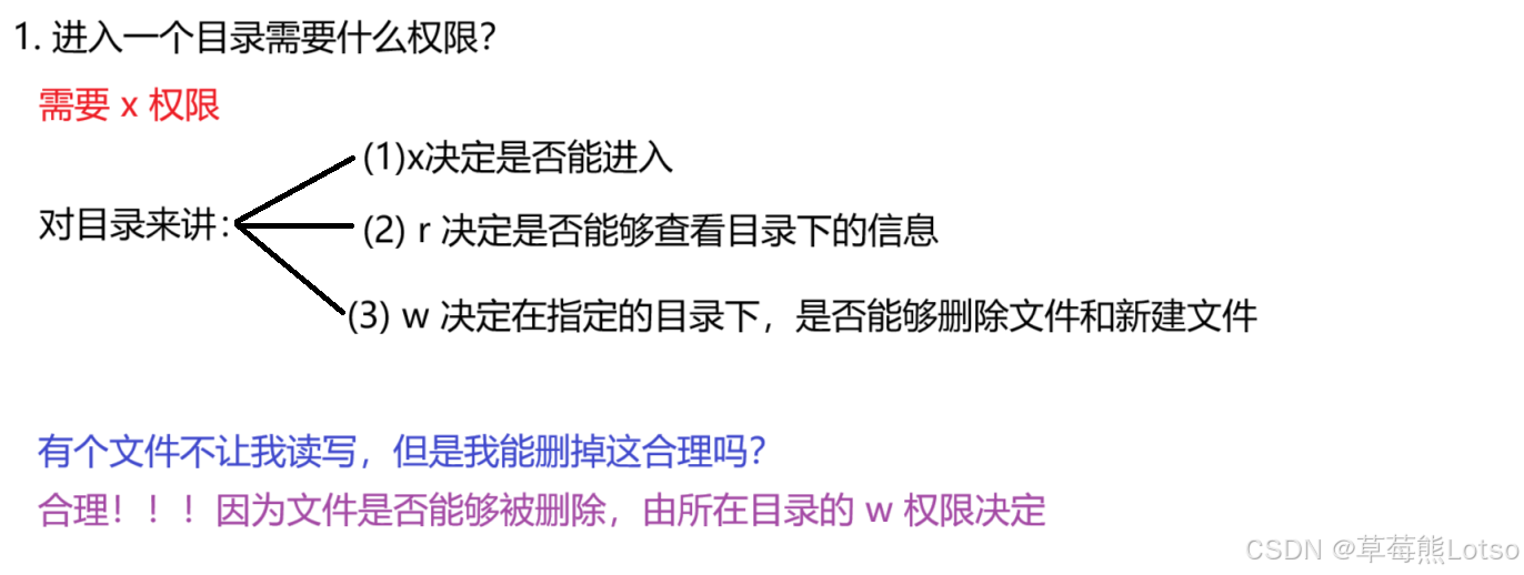 可执行权限(x):无 x 权限则无法cd进入目录;可读权限(r):无 r 权限则无法用ls等命令查看目录内文件;可写权限(w):无 w 权限则无法在目录中创建、删除文件。