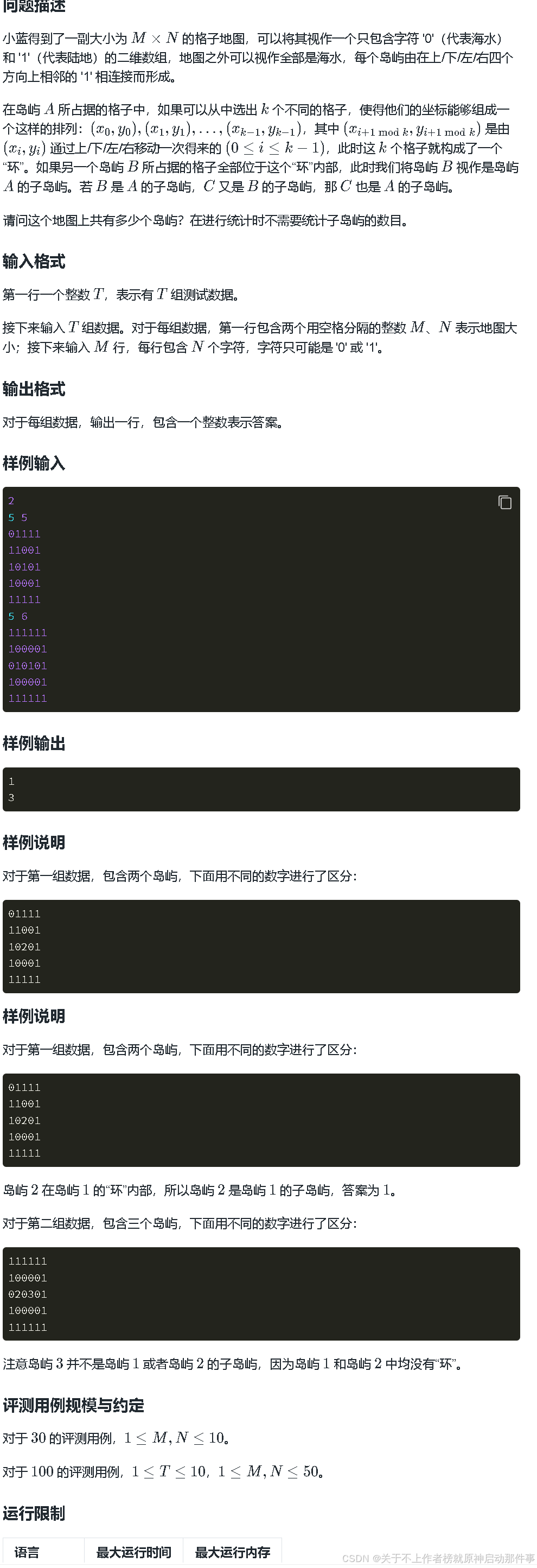这个题想清楚了其实很简单,要我们找外面没有环的岛屿,从里面往外面找很难写,暂时没有想到,但是我们可以从外面向里面找,让海水去流动,如果岛屿是一个环的情况,我们海水是进不去的,所以大体思路就是从外面一圈海水的地方去搜索,遇到一个岛进行答案记录,然后进行dfs或者bfs去找相邻的岛,全部标记,这样就标记了一个岛屿,